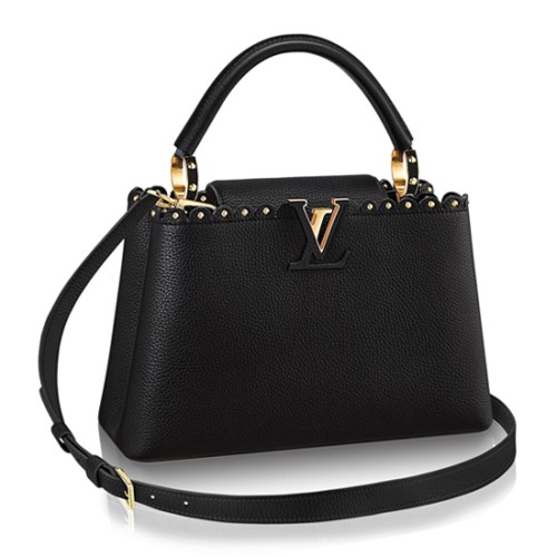 This elegant Capucines PM is softened by a delicate and feminine cut inspired by the lace croquets technique. The chiseled edges, with a precious stud at their center, are inspired by the iconic Monogram Flower and by the nails on historic House Trunks.