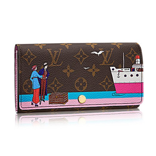This envelope-style Sarah Wallet in Monogram canvas is decorated with a print evoking the golden age of Transatlantic cruises and Louis Vuitton's history as an innovator in the world of travel. The ingeniously designed interior features a variety of pockets and credit card slots.
