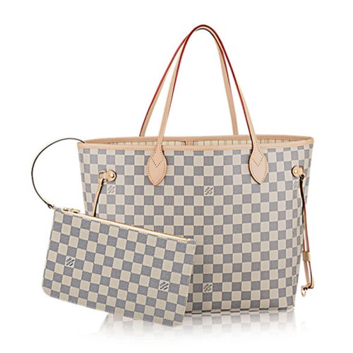 Legendary Neverfull: always exactly what you need it to be. Capacious but not bulky, structured yet supple, at home on the town or in the country. Cinch the side laces, and voila! it's a sleek city bag. Loosen them and you have a chic, practical tote. The slim leather handles fit over the shoulder or on the arm. Shown here in Damier Azur canvas.