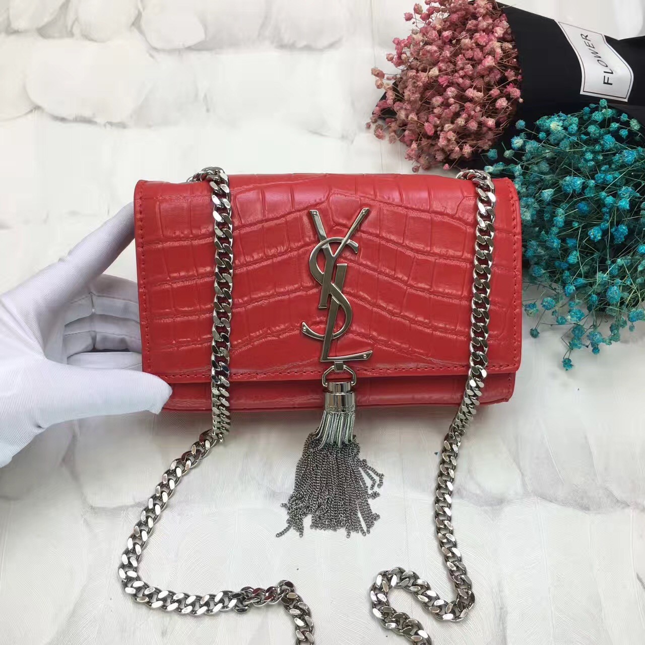 • YSL Tassel Chain Bag 17cm Croco Red Silver